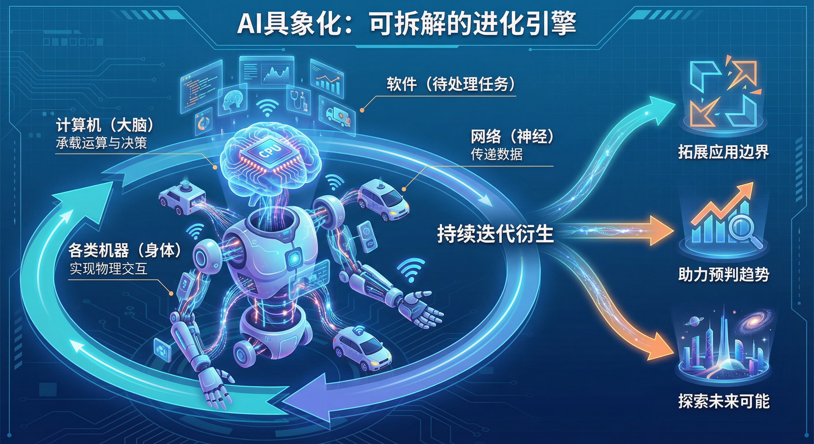 人工智能的具象化 [2026-01-03] | [taa] | [AI感悟] | [13 views] AI具象化可拆解:以计算机为“大脑”承载运算与决策,各类机器作“身体”实现物理交互,网络模拟“神经”传递数据,软件则对应待处理任务。以此为基础持续迭代衍生,能拓展应用边界,助力预判趋势、探索未来可能。 [Previous: 扣子的转变] | [Next: 先做后想,现阶段的试错成本低]
