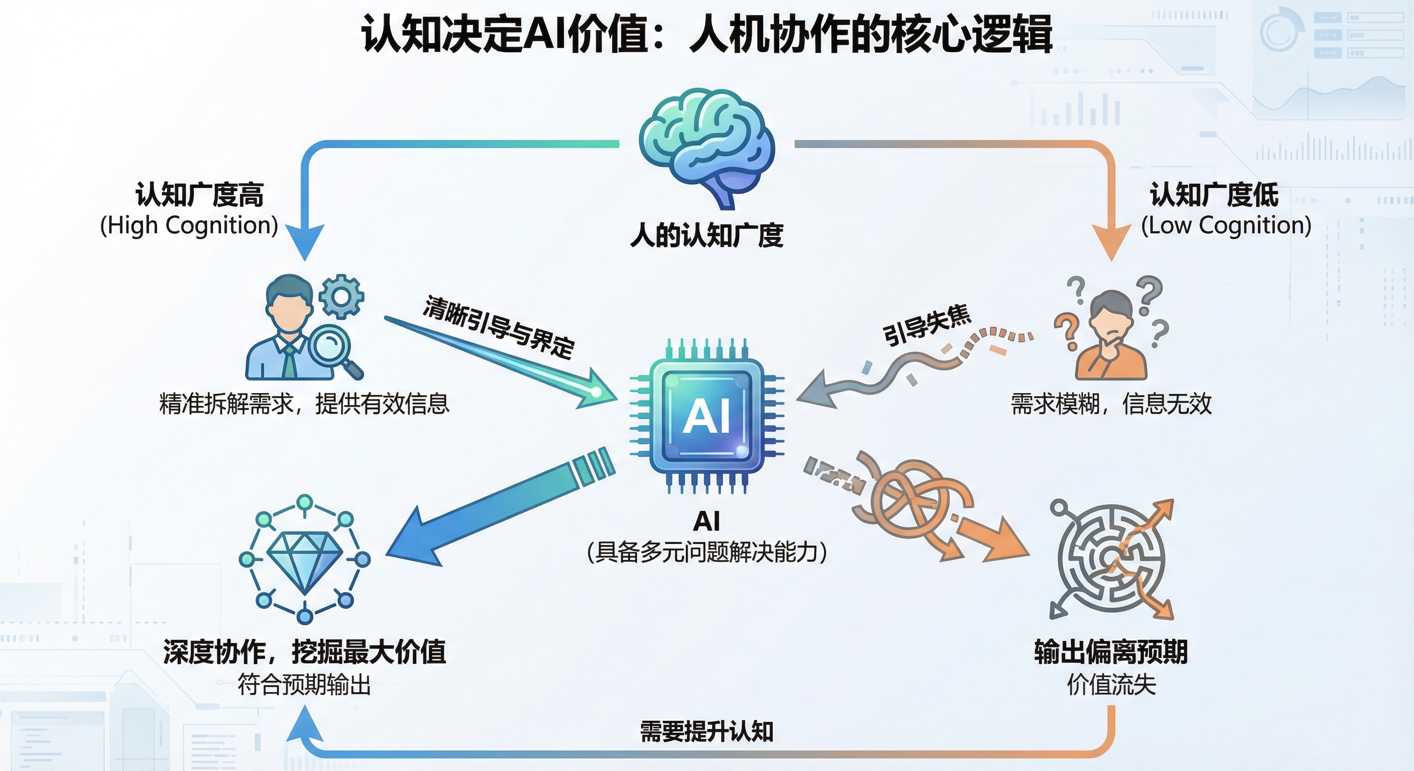 认知的广度变得很重要 [2026-01-07] | [taa] | [AI感悟] | [7 views] AI具备多元问题解决能力,但其输出依赖人类输入的引导与界定。人的认知广度决定了能否精准拆解需求、提供有效信息,进而让AI聚焦核心问题。认知越广,越能与AI在多维度深度协作,挖掘其价值;反之,易因需求模糊导致AI输出偏离预期。 [Previous: 硬件开发回馈的想法] | [Next: 使用AI正在拉开差距]