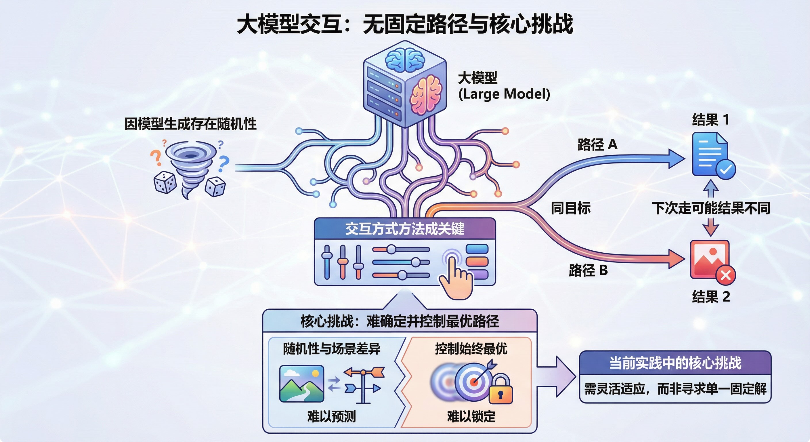 寻找最优解 [2026-01-08] | [taa] | [AI感悟] | [9 views] 大模型交互无固定路径,因模型生成存在随机性,同目标下次走可能结果不同。此时交互方式方法成关键,但因随机性与场景差异,难确定并控制始终最优的路径,这是当前实践中的核心挑战。 [Previous: 使用大模型处理时的混乱] | [Next: 使用模型的过程就是一个自我学习的过程]