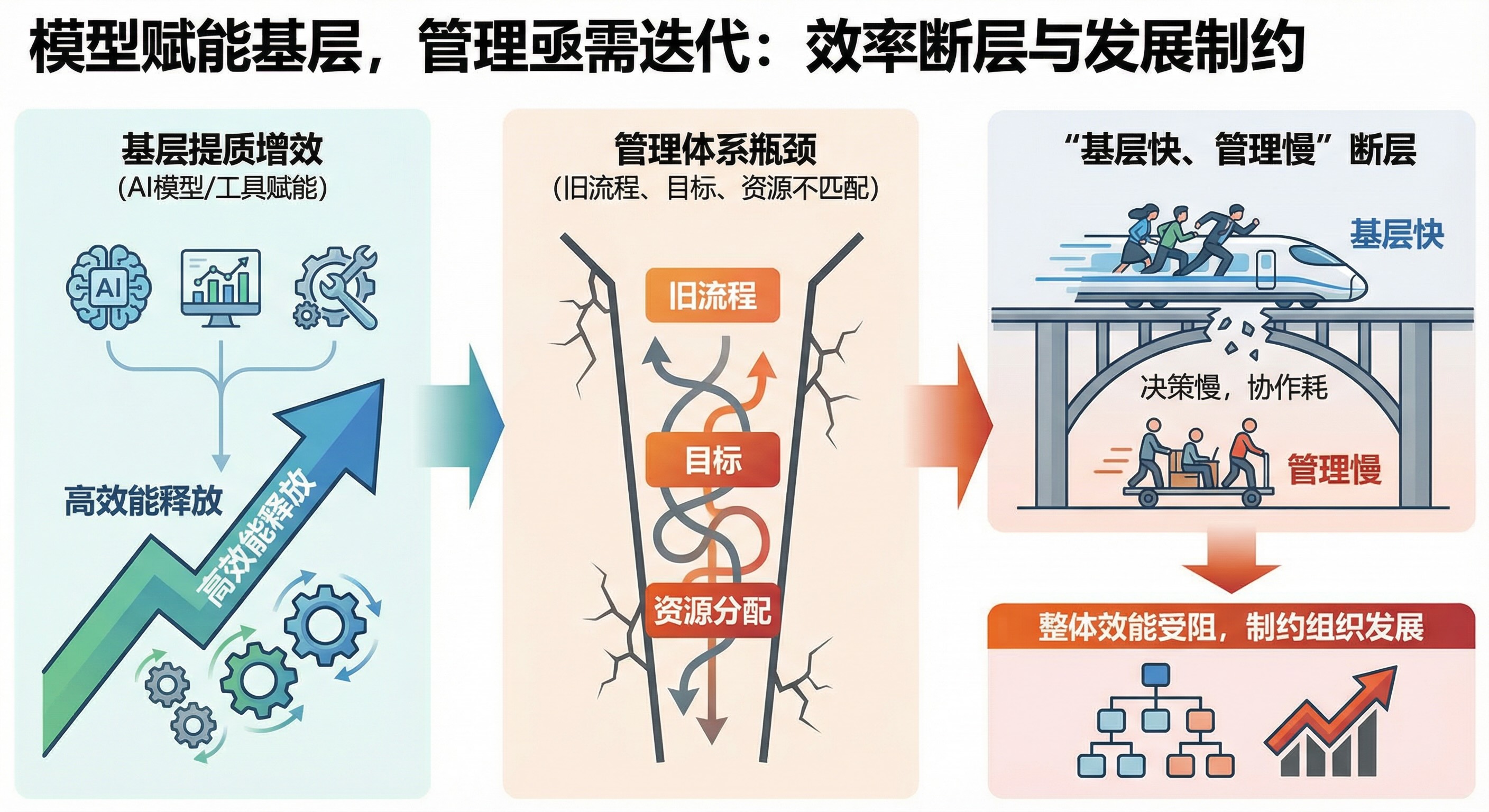 底层提效与管理 [2026-01-15] | [taa] | [AI感悟] | [18 views] 基层借模型工具提质增效后,管理体系成新瓶颈。旧流程、目标与资源分配难匹配高效能,易致决策慢、协作耗。若管理未同步迭代,将出现“基层快、管理慢”断层,使基层效率无法转化为组织整体效能,最终制约发展。 [Previous: vibe coding的启发] | [Next: 寻找模型通路并固化]