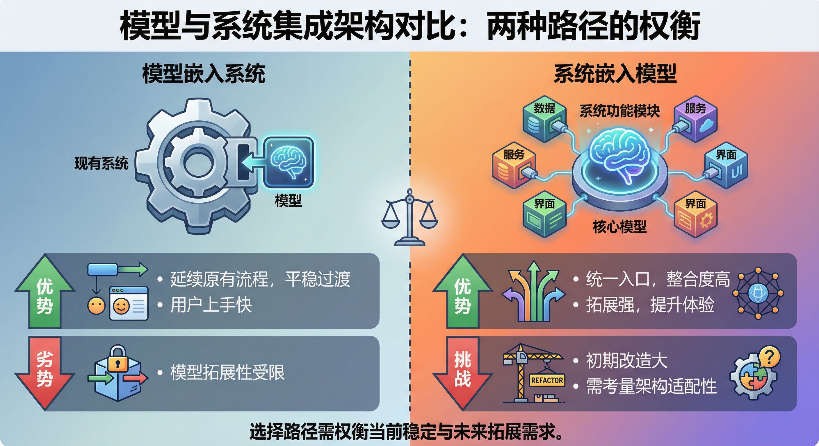 是模型嵌入到系统里还是系统嵌入到模型 [2026-01-19] | [taa] | [AI感悟] | [21 views] 模型嵌入系统,系统入口可延续原有流程,利于平稳过渡与用户上手,但模型拓展性受限。系统嵌入模型,模型能成统一入口,整合度高、拓展强,可提升用户体验,但初期改造大,需考量系统架构适配性。 [Previous: 如何高效使用大模型] | [Next: 让模型确定性答案的思路]
