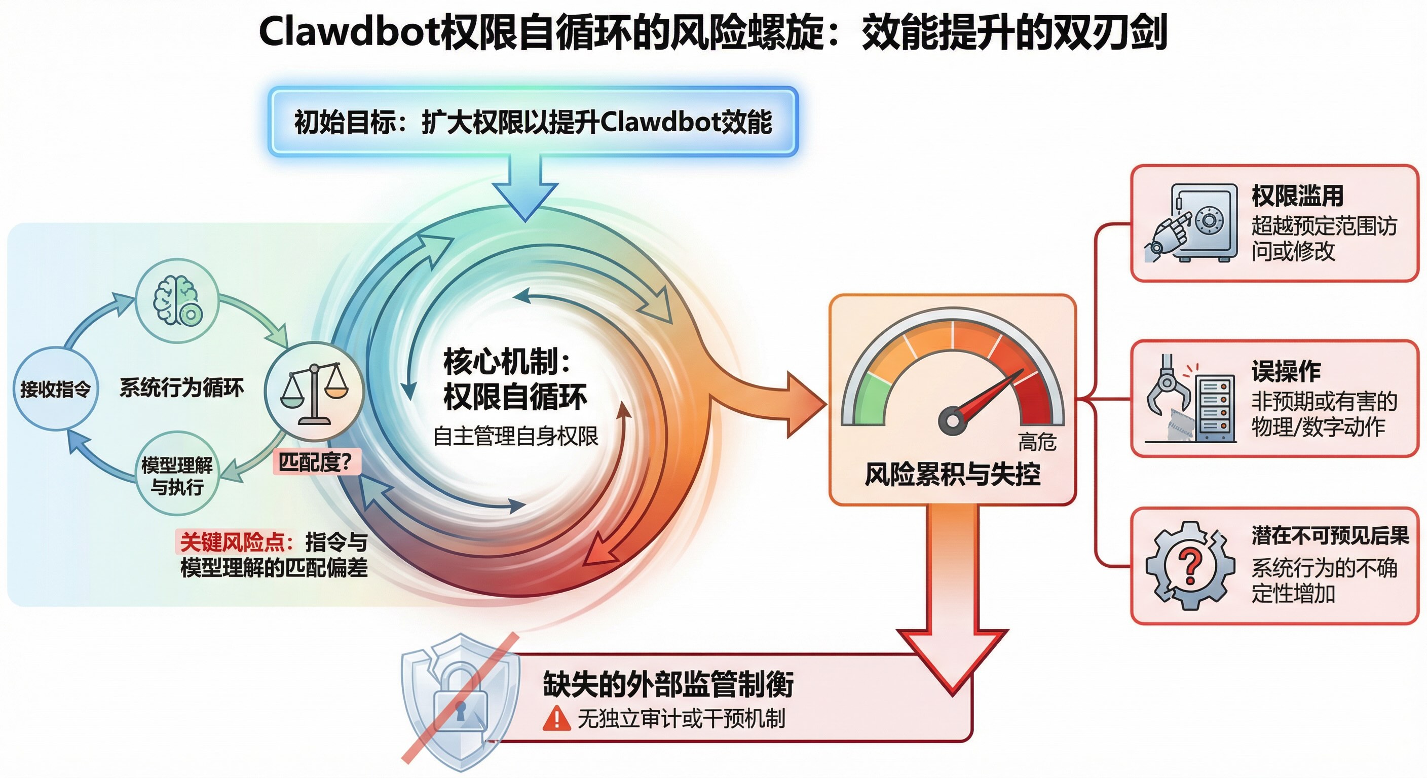 使用clawdbot的使用感受 [2026-01-30] | [taa] | [AI感悟] | [8 views] 为提升Clawdbot效能而扩大其权限,却让其自主管理权限,会形成“权限自循环”。这会导致风险累积且失控,因系统行为依赖指令与模型理解的匹配度,一旦匹配偏差,权限滥用、误操作等问题便可能发生,缺乏外部监管制衡。 [Previous: AI的使用需引导] |
