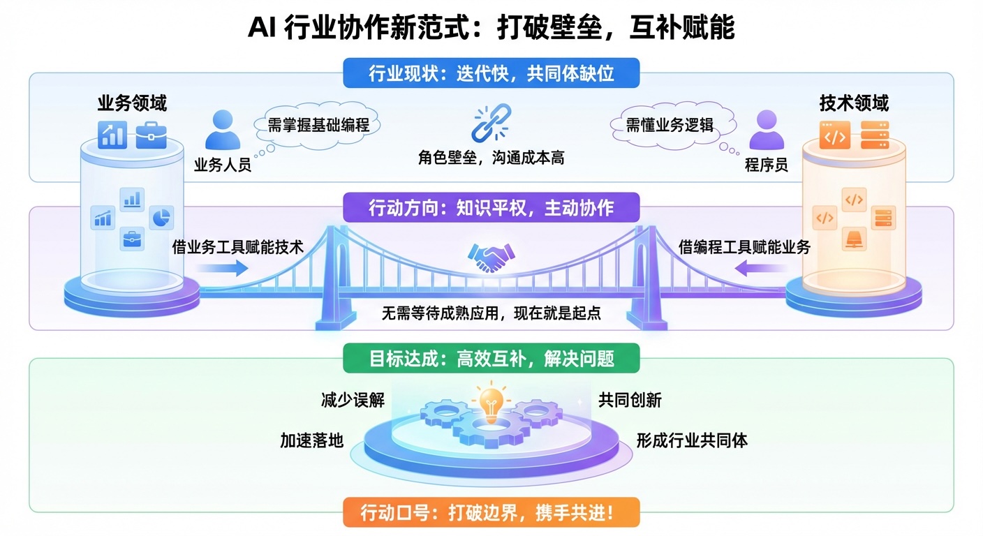 大模型的出现决定跨界工作是必须的 [2026-02-01] | [taa] | [AI感悟] | [70 views] 当前AI模型与应用迭代快,但行业共同体尚未形成。因模型知识平权,需打破角色壁垒:业务人员要掌握基础编程能力,程序员需懂业务逻辑,以此减少沟通成本。无需等待成熟应用,双方应借各自工具互补赋能,主动协作解决问题。 [Previous: 由vibe coding衍生的] | [Next: 只有魔法才能打败魔法]