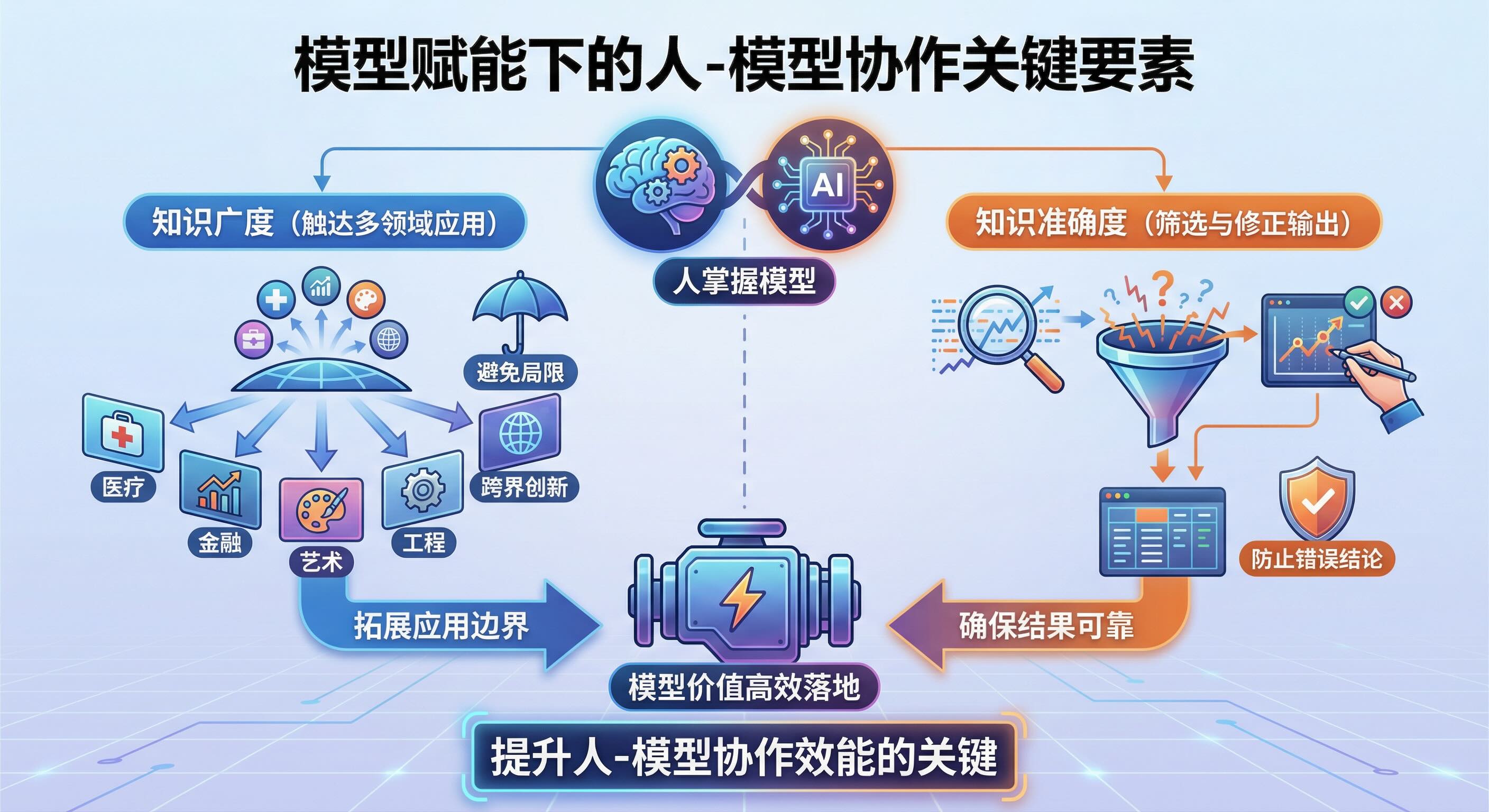 在模型的加持下,掌握知识的广度和准确度变得重要 [2026-02-02] | [taa] | [AI感悟] | [41 views] 模型赋能下,人掌握模型后,知识广度决定能否触达多领域应用场景,避免局限;知识准确度则是筛选模型输出、修正偏差的核心,防止错误结论。二者共同保障模型价值高效落地,是提升人-模型协作效能的关键。 [Previous: 只有魔法才能打败魔法] | [Next: 活学活用变得更重要]