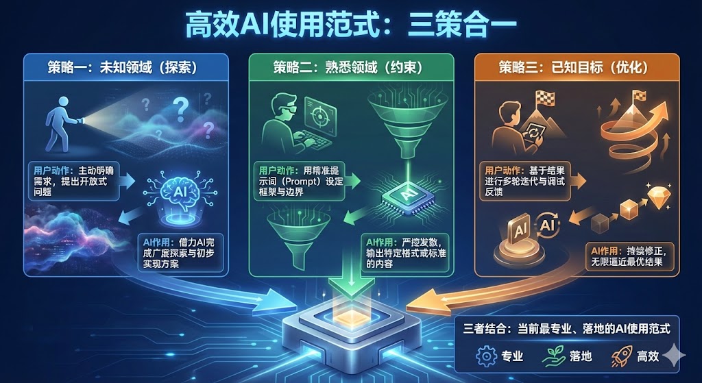 与AI交互的方式 [2026-02-14] | [taa] | [AI感悟] | [52 views] 高效用AI分三类策略:未知领域主动明确需求,借力AI完成探索与实现;熟悉领域用精准提示词约束输出,严控发散;已知目标时,通过多轮迭代调试,让AI持续逼近最优结果。三者结合,是当前最专业、落地的AI使用范式。 [Previous: 不是什么事都交给AI] | [Next: 人工智能在改变我们的工作方式]