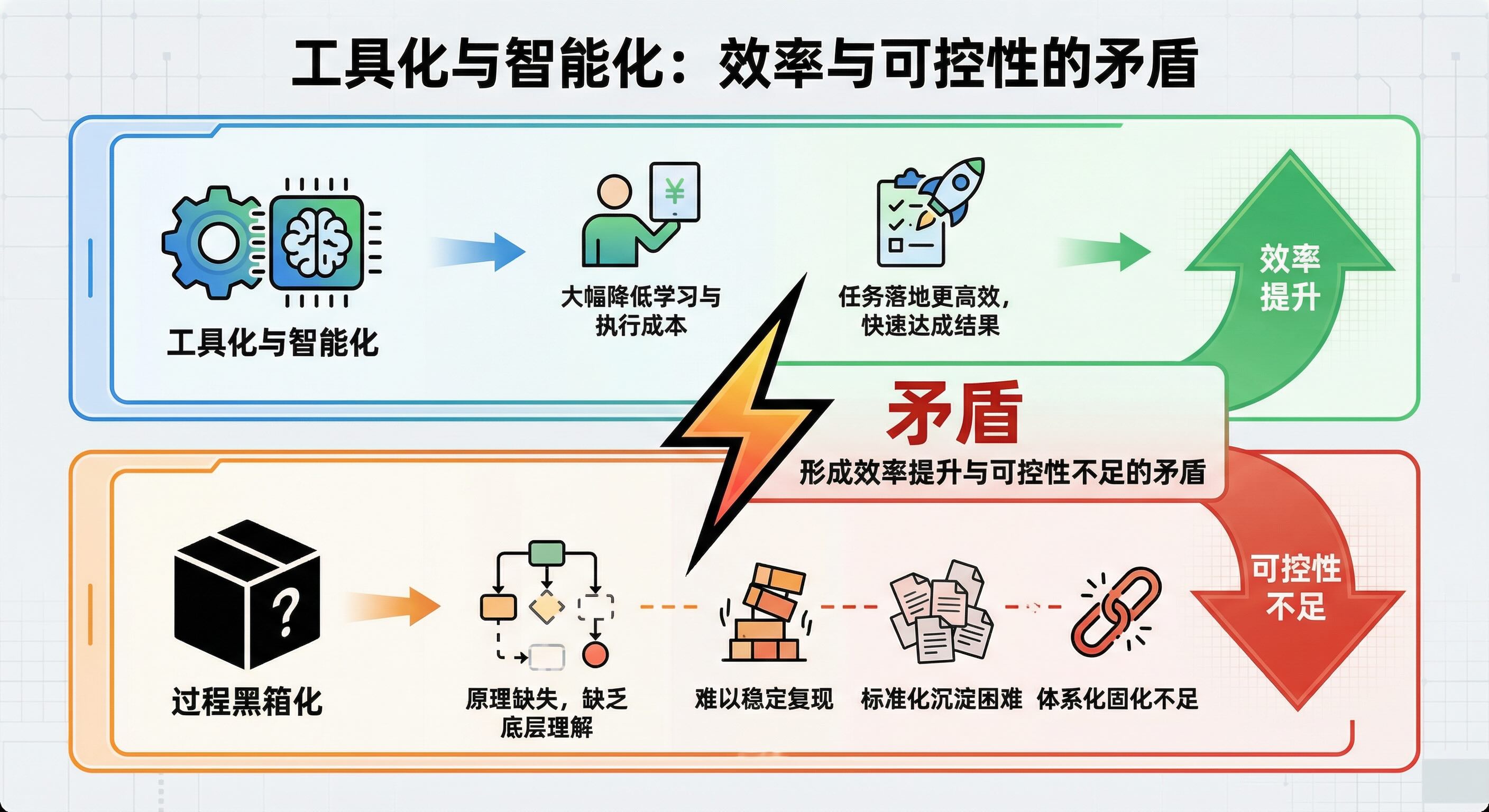 有了AI以后带来的变化 [2026-02-20] | [taa] | [AI感悟] | [51 views] 工具化与智能化大幅降低学习与执行成本,任务落地更高效,但过程黑箱化导致原理缺失。虽能快速达成结果,却因缺乏底层理解,难以稳定复现、标准化沉淀与体系化固化,形成效率提升与可控性不足的矛盾。 [Previous: 人工智能在改变我们的工作方式] | [Next: windows取代了dos,但dos一直没有消失]