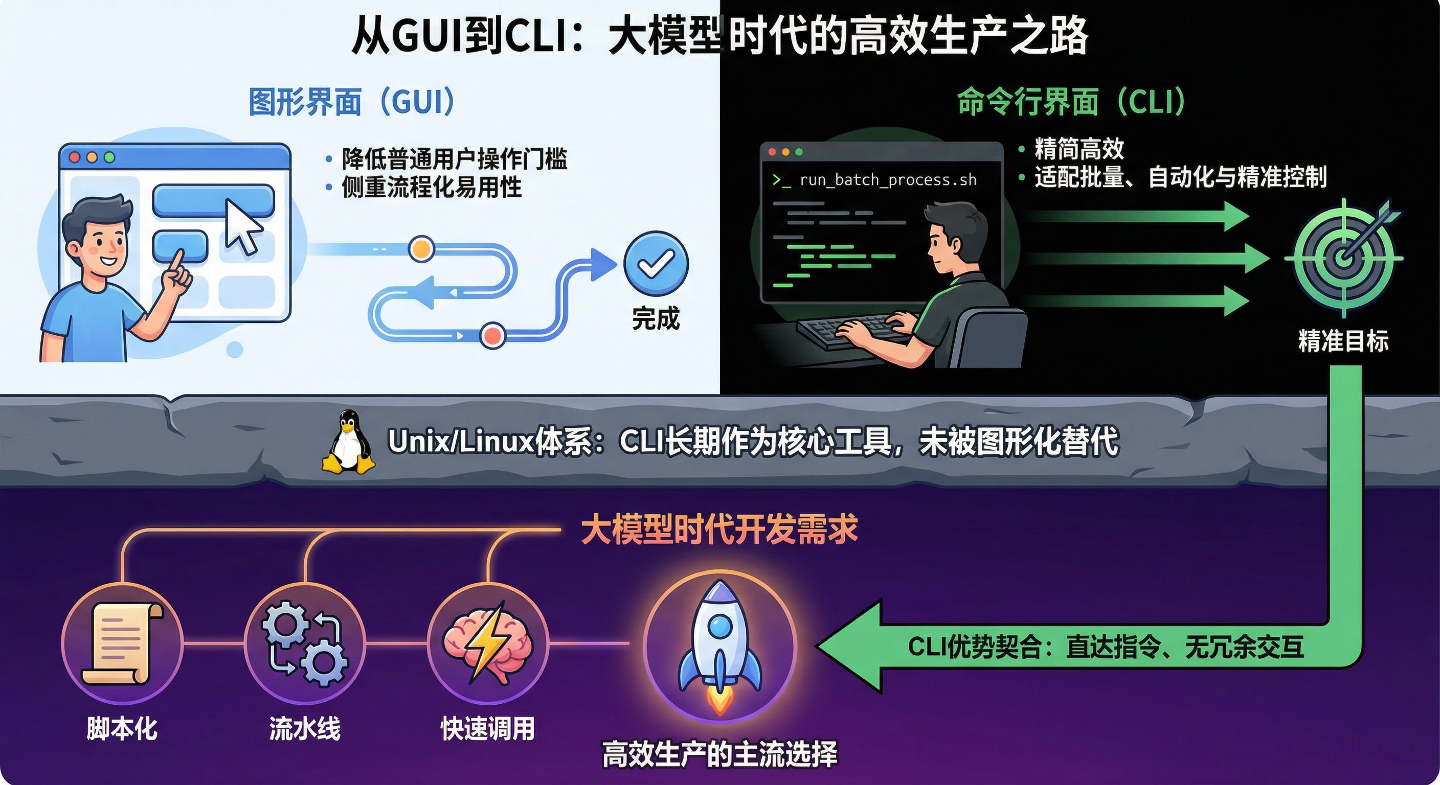 图形界面降低普通用户操作门槛,侧重流程化易用性;命令行界面精简高效,适配批量、自动化与精准控制。Unix/Linux体系中CLI长期作为核心工具,并未被图形化替代。大模型时代开发强调脚本化、流水线与快速调用,CLI直达指令、无冗余交互,自然就成为了高效生产的主流选择。