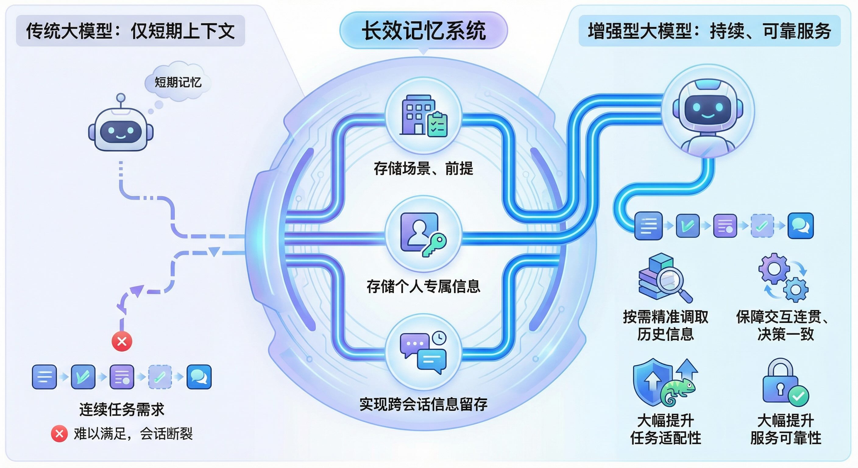 现在的大模型需要一套记忆系统 [2026-02-22] | [taa] | [AI感悟] | [50 views] 大模型仅靠短期上下文难以满足连续任务需求,长效记忆系统可存储场景、前提与个人专属信息,实现跨会话信息留存。它能支撑模型在稳定环境中持续服务,按需精准调取历史信息,保障交互连贯、决策一致,大幅提升任务适配性与服务可靠性。 [Previous: 人工智能的安全性] | [Next: 二进制的想法]