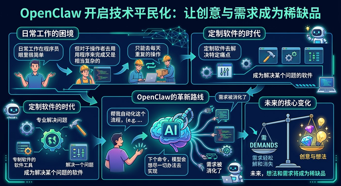 openclaw是一种技术平民化的路线。有时候我们日常的工作在程序员的眼里是很简单的事,但对于操作者去用程序来完成又是相当复杂的,因此只能去每天重复的操作。这样一些定制软件就去解决这些痛点,成为了解决某个问题的软件。现在用类似于open claw这样的工具,普通人下个命令,模型就会想尽一切办法去实现。这样需求就被消化了。未来需求和想法将会变成稀缺品。