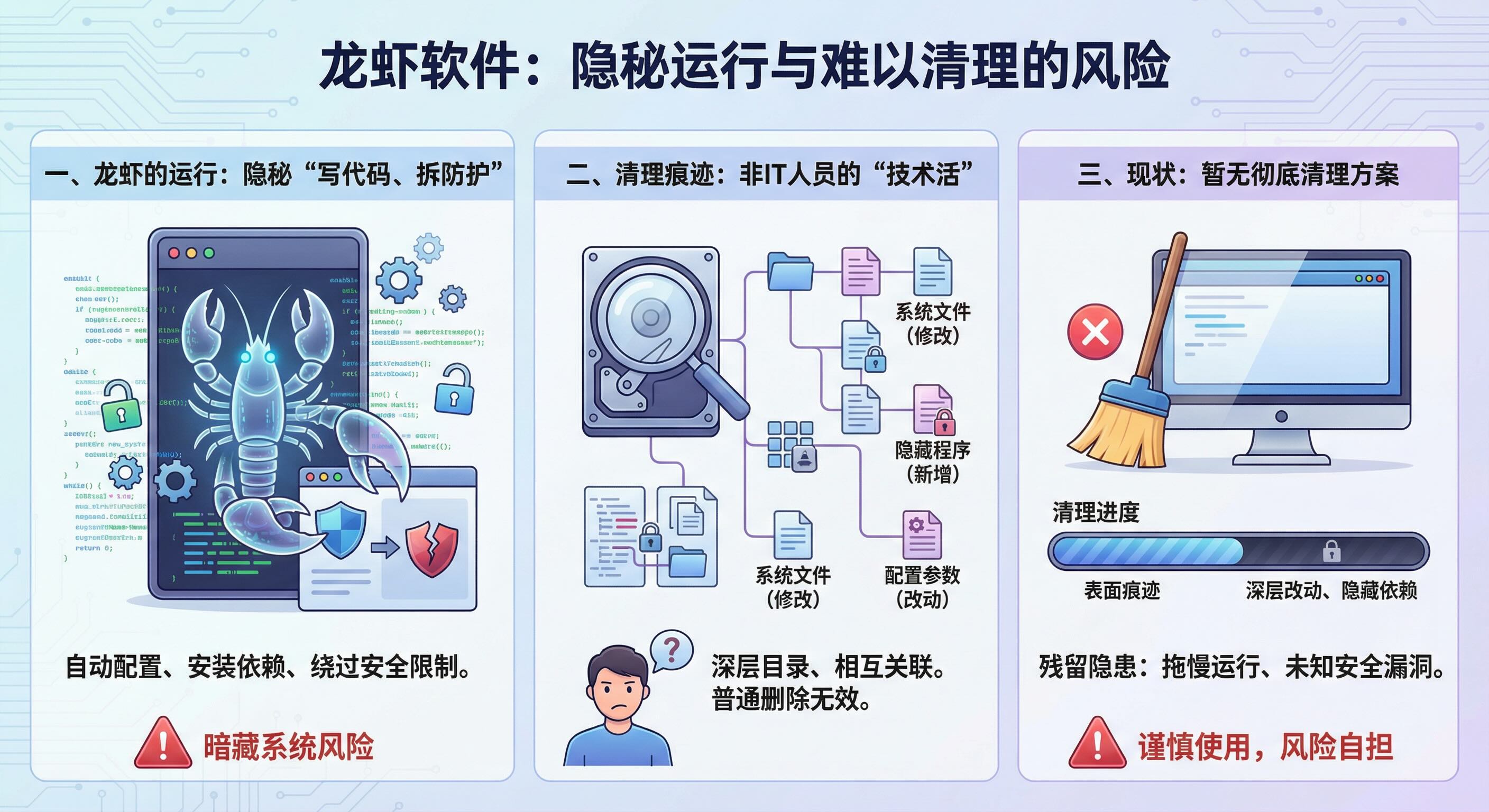 安装龙虾容易,可它运行后留下的“后遗症”却难处理。它会在电脑里留下大量痕迹:修改过的系统文件、新增的隐藏程序、改动的配置参数,甚至可能在后台留下缓存和关联数据。这些痕迹不像删除普通文件那样简单,很多都藏在电脑深层目录,还和系统功能相互关联,没有专业的IT知识,根本找不到所有痕迹,更别说彻底删除了。