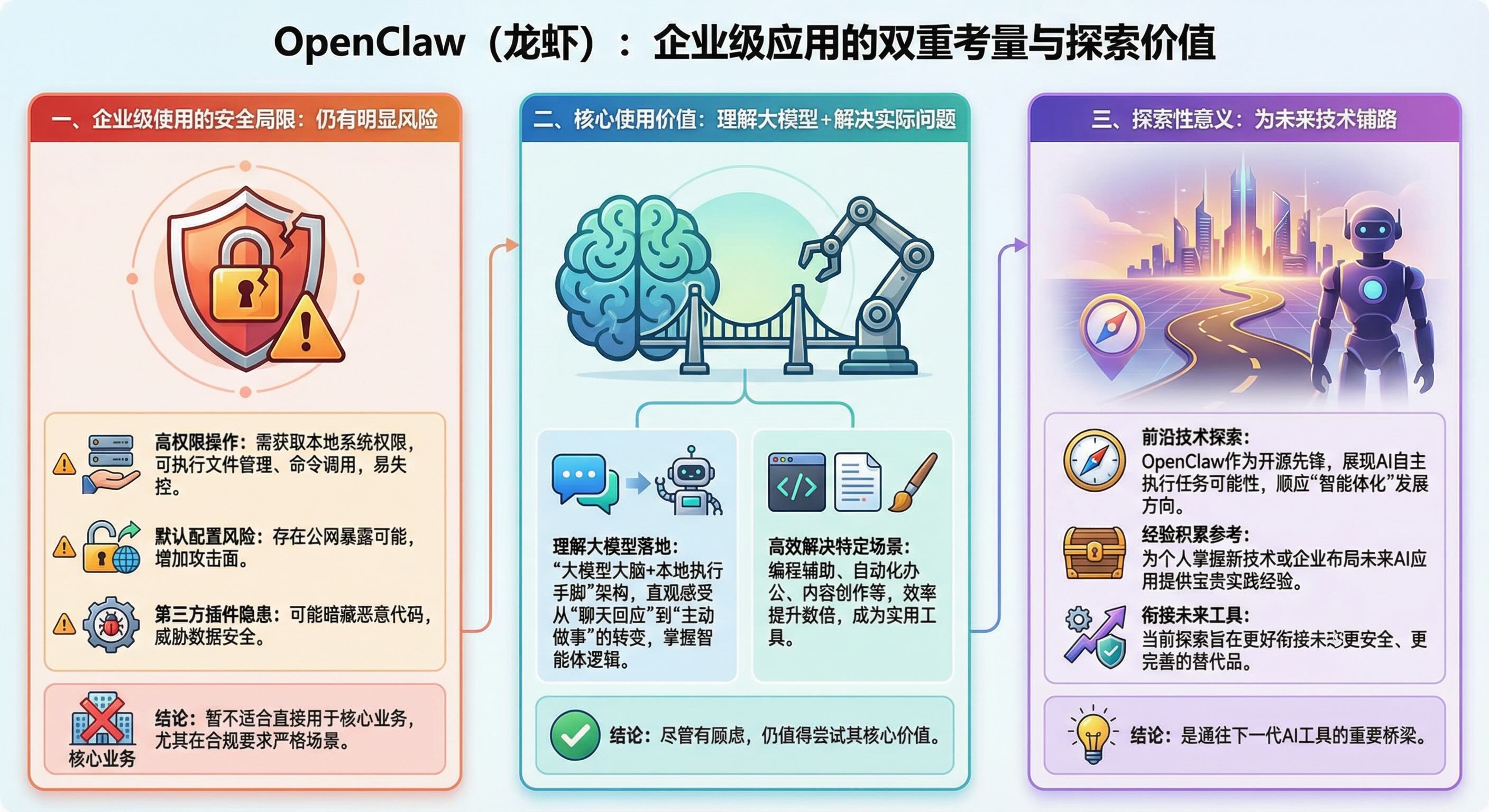 OpenClaw(昵称“龙虾”)作为开源AI智能体,虽功能强大但安全性尚未达到企业级标准。它需要获取本地系统操作权限,可执行文件管理、命令调用等敏感操作,且默认配置存在公网暴露风险,第三方插件也可能暗藏恶意代码。对企业而言,这类高权限工具可能导致数据泄露、系统被控制等问题,尤其在合规要求严格的场景中,暂不适合直接用于核心业务。