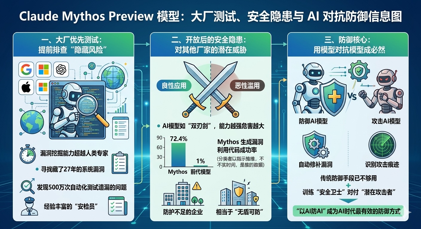 面对AI带来的新风险,传统防御手段已经不够用了。就像用病毒查杀软件对付电脑病毒,未来防御AI攻击,也得靠更强大的AI模型。Claude新模型的测试案例证明,AI能精准找到系统漏洞,反过来,也能让AI提前识别攻击痕迹、修补漏洞、抵御恶意利用。这种“以AI防AI”的思路,就是用模型的能力对抗模型的风险,就像训练“安全卫士”专门对付“潜在攻击者”,成为AI时代最有效的防御方式。