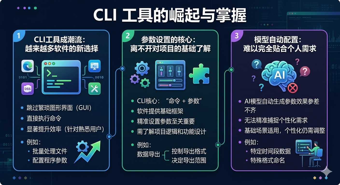 如今打开各类开发工具或实用软件,不难发现“命令行界面(CLI)”正在成为热门配置。不管是代码管理、文件处理,还是数据统计类软件,都纷纷推出CLI功能。这种趋势的核心原因很简单——CLI能跳过繁琐的图形界面,直接用命令快速执行操作,对熟悉操作逻辑的用户来说,效率提升十分明显。比如批量处理文件、配置程序参数时,一行命令往往能代替多次鼠标点击,这也是它受欢迎的关键。也更适合大模型去调用。