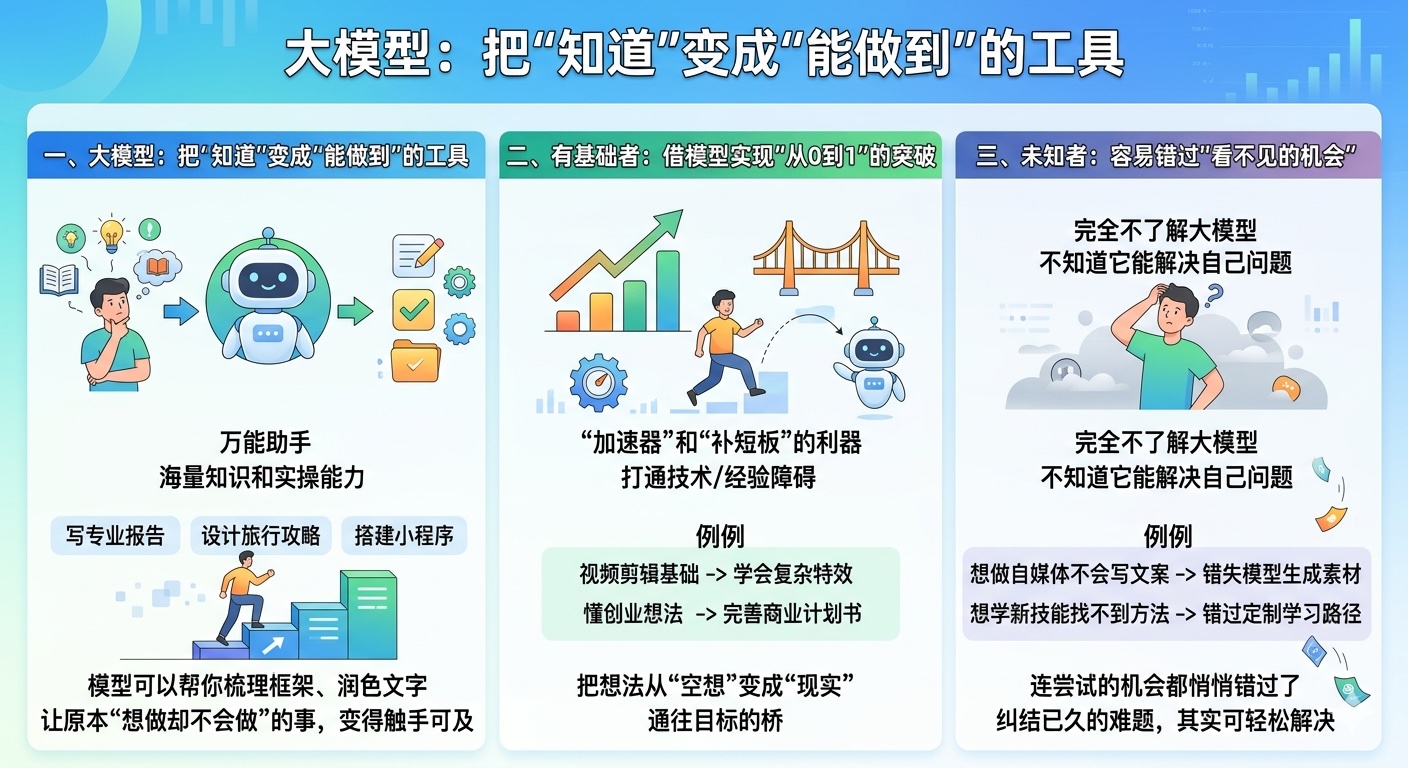 大模型就像一个万能助手,自带海量知识和实操能力。以前我们可能心里清楚一件事该做,比如写一篇专业报告、设计一份旅行攻略,或是搭建一个简单的小程序,但因为缺乏实操经验、不懂具体方法,只能停留在“知道”的层面。而现在,大模型能一步步指导流程、补充细节,甚至直接辅助完成核心工作——比如你知道要写报告,却不懂结构和措辞,模型可以帮你梳理框架、润色文字;你知道旅行要规划路线,模型能根据你的需求搭配行程,让原本“想做却不会做”的事,变得触手可及。